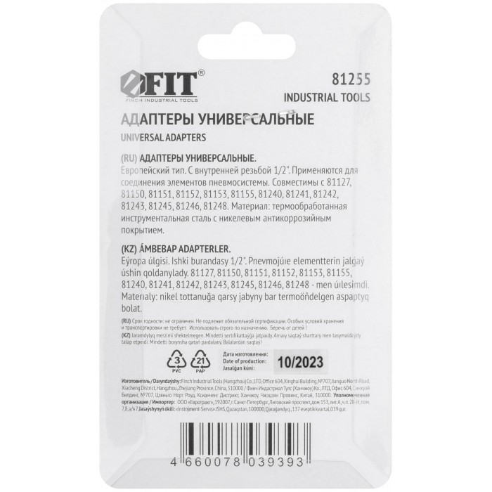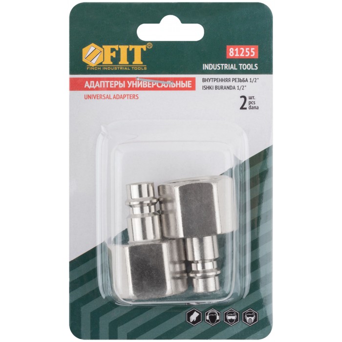 Адаптеры универсальные. Европейский тип. Быстросъемное соединение - внутренняя резьба. Применяются для соединения элементов пневмосистемы. Совместимы с 81127, 81150, 81151, 81152, 81153, 81155, 81240, 81241, 81242, 81243, 81245, 81246, 81248. Материал: инструментальная сталь с никелевым антикоррозийным покрытием. Упаковка: блистер.