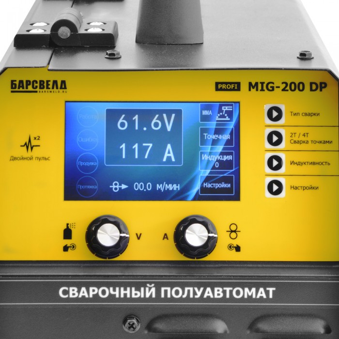 БАРСВЕЛД Profi MIG-200 DP НАКС универсальный сварочный полуавтомат, предназначенный для сварки изделий из черных и цветных металлов в следующих режимах: - Ручная дуговая сварка плавящимся штучным электродом (MMA) - Полуавтоматическая сварка электродной проволокой в среде защитных газов (MIG/MAG) - Сварка неплавящимся вольфрамовым электродом в среде инертных газов (TIG) - Режим двойного пульса