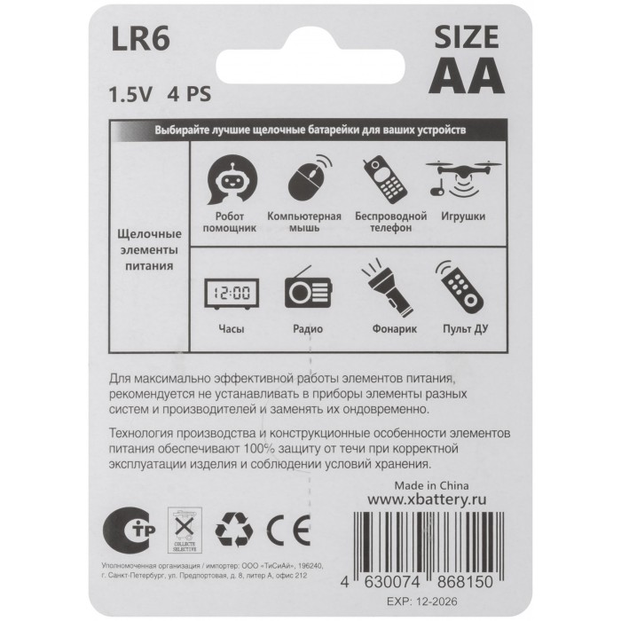1,5 В, 2700 мА/ч, 23,5 г. Расчетное удержание заряда при 20 °С: после 12 месяцев хранения 93%; после 24 месяцев хранения 88%. Упаковка: блистер.