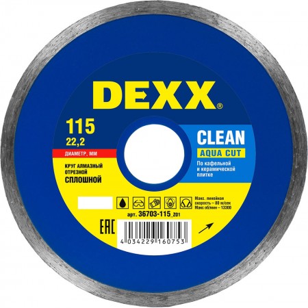 Сплошной алмазный диск Clean Aqua Cut, 115 мм, (22.2 мм, 5 х 1.7 мм) DEXX 36703-115_z01
