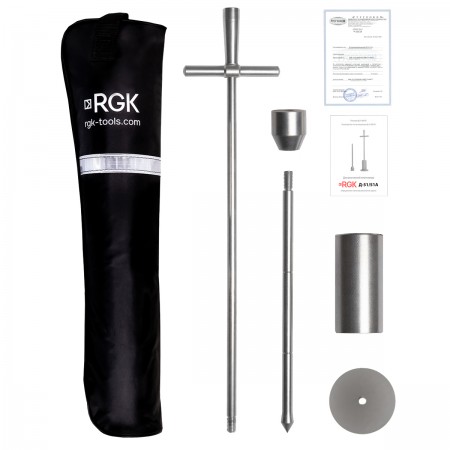 Плотномер динамический RGK Д-51А отличается от базовой версии инструмента наличием штампа, который накручивается на направляющую штангу и позволяет проводить замеры плотности грунта и определять качество его уплотнения методом двойного зондирования. Такая технология используется в тех случаях, когда нет возможности узнать влажность песка или другого материала и в ситуациях, когда грунт имеет значительную твердость.