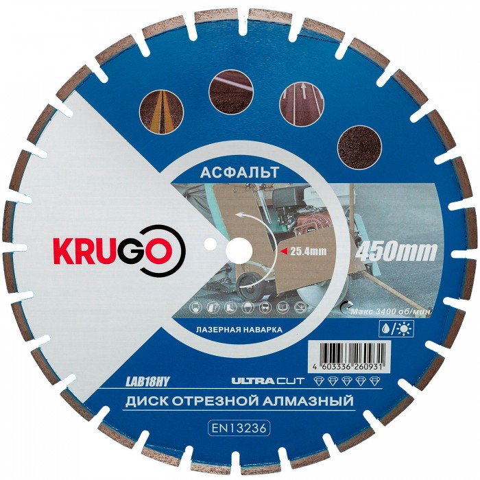Диск алмазный сегментный по асфальту (лазерная наварка) 450x25.4x40x3.6x10/17mm KRUGO (LAB18HY)