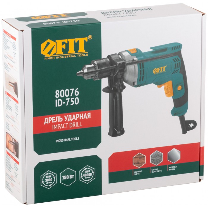 Дрель ударная 750 Вт; 0-3000 об/мин; КлП 13 мм; 2,4 кг; мет. корп.; рез. накл.; коробка (80076)