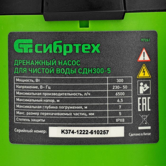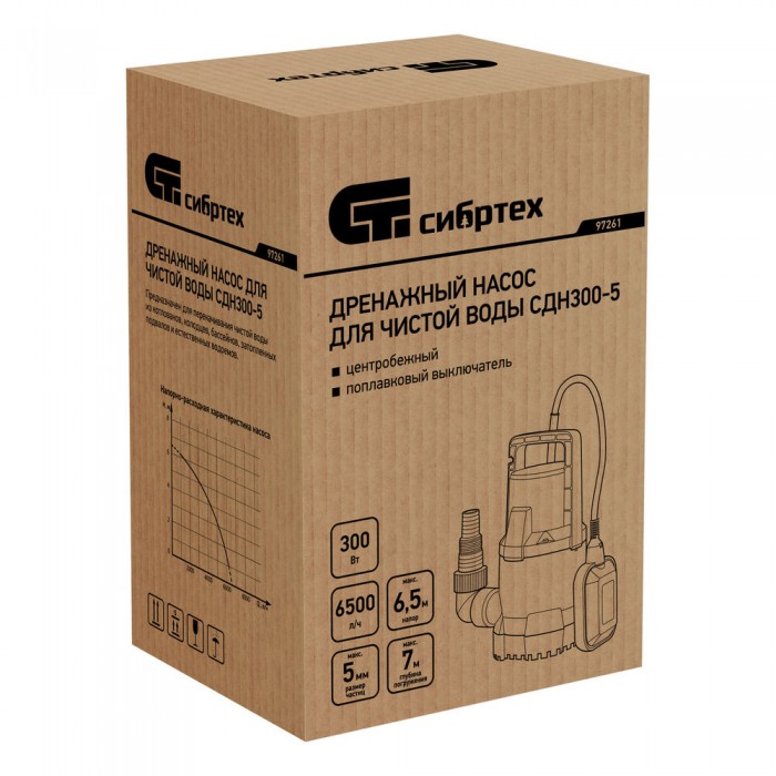 Дренажный насос для чистой воды СДН300-5, 300 Вт, напор 6.5м, 6500 л/ч Сибртех (97261)