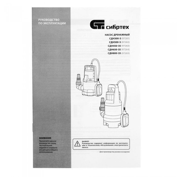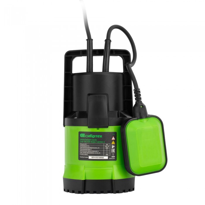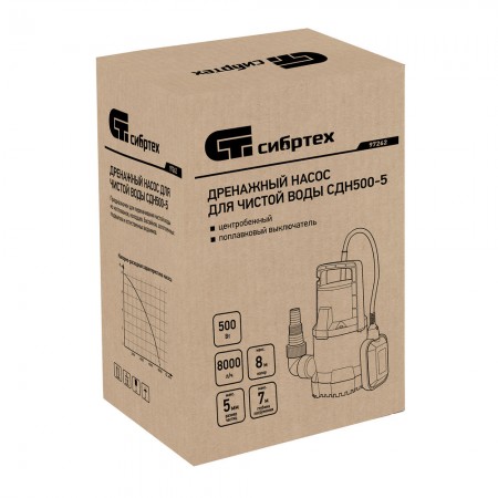 Дренажный насос для чистой воды СДН500-5, 500 Вт, напор 8 м, 8000 л/ч Сибртех (97262)