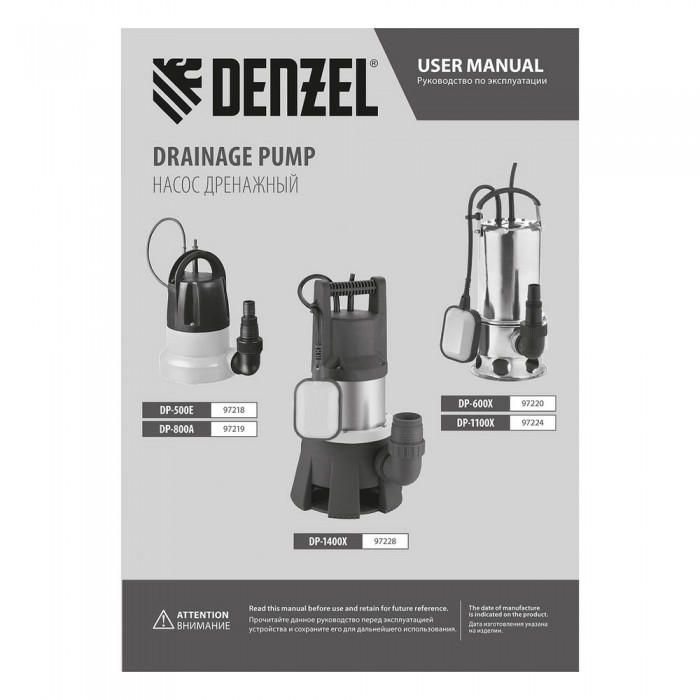 Дренажный насос DP800A, 800 Вт, подъем 5 м, 13000 л/ч Denzel (97219)