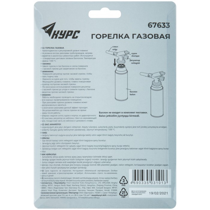 С пьезоподжигом и регулировкой уровня пламени. Для розжига костра, разогрева трубопроводов, нагрева предметов и различных ремонтных работ. Используется со стандартным цанговым газовым баллоном. Температура пламени 1300 º С. Материал: медное сопло, курок и корпус из ударопрочного ABS пластика, регулятор из нейлона, ствол из нержавеющей стали, посадочная часть из нейлона и цинкового сплава. Упаковка: блистер.