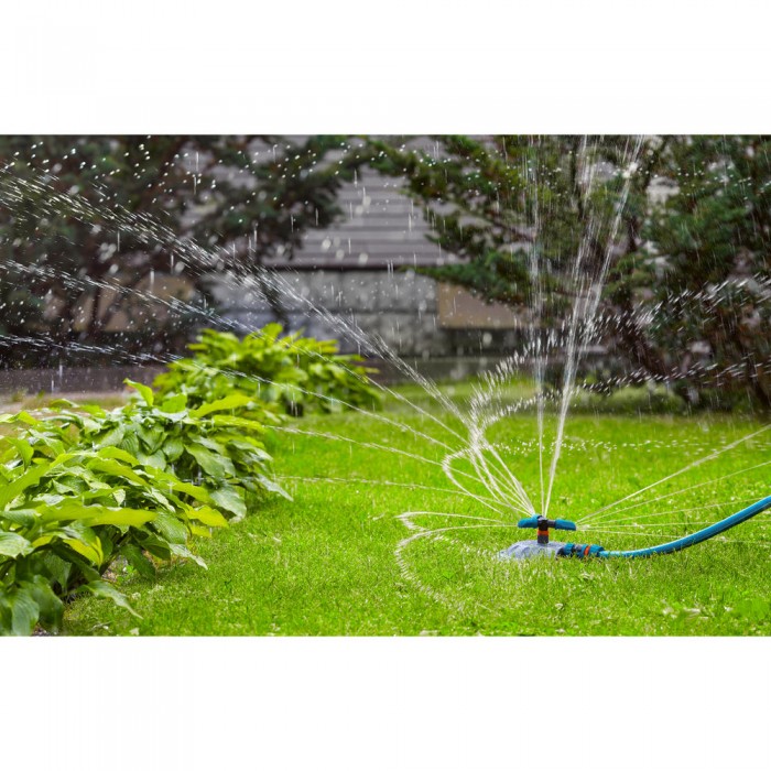 - 3 поворотных сопла позволяют настроить радиус полива и обеспечивают его равномерность. Конструкция из ударопрочного пластика гарантирует прочность и долговечность изделия. Специальная подставка обеспечивает устойчивость установленного распылителя.