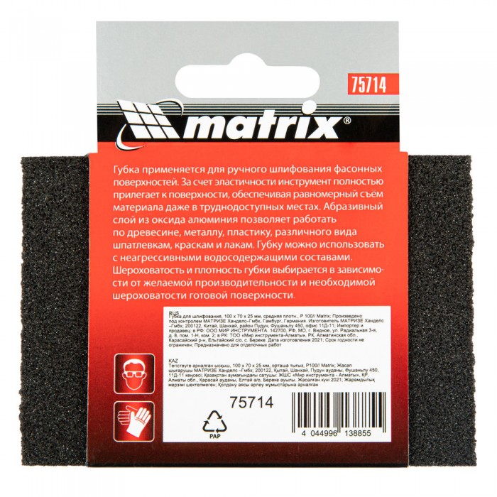 Губка для шлифования, 100 х 70 х 25 мм, средняя плотность, P 100 Matrix (75714)