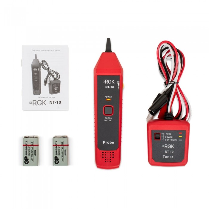 Комплект состоит из тон-генератора и приемника, общий вес которых не превышает 300 г, что делает эту модель удобной и очень мобильной. Трансмиттер на 10 мВт оборудован тестовыми проводами с универсальными зажимами и штекером интерфейса RJ11 для упрощенного подключения тестера кабеля RGK NT-10 к телефонным сетям. С помощью регулятора громкости на приемнике выставляется комфортный уровень звуковой сигнализации.