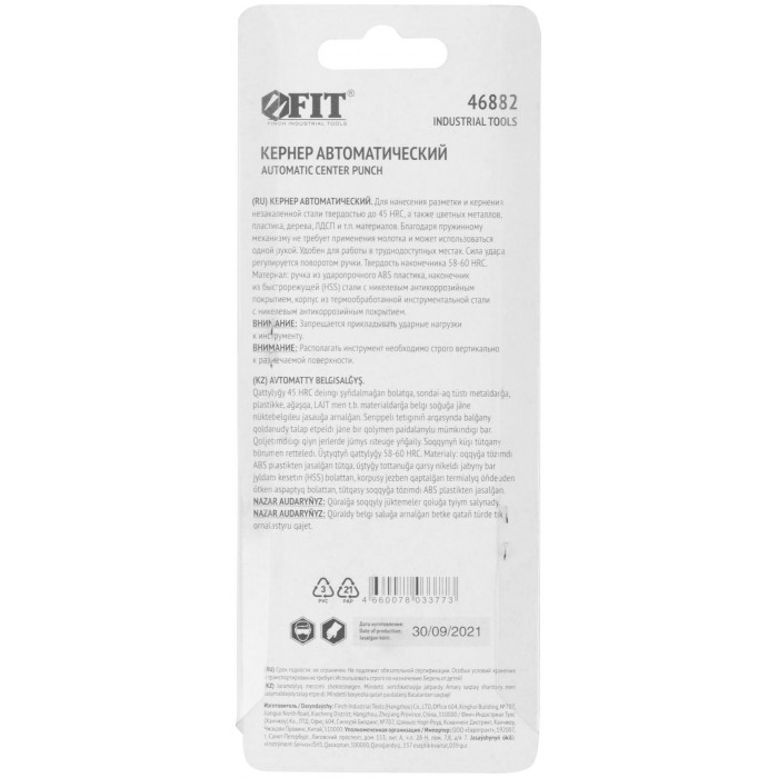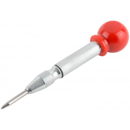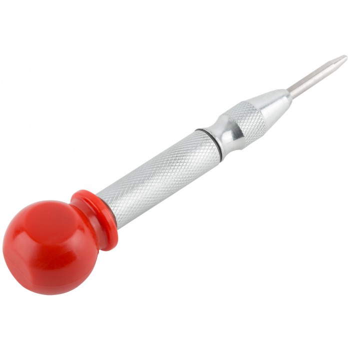 Для нанесения разметки и кернения незакаленной стали твердостью до 45 HRC, а также цветных металлов, пластика, дерева, ЛДСП и т.п. материалов. Благодаря пружинному механизму не требует применения молотка и может использоваться одной рукой. Удобен для работы в труднодоступных местах. Сила удара регулируется поворотом ручки. Твердость наконечника 58-60 HRC. Материал: ручка из ударопрочного ABS пластика, наконечник из быстрорежущей (HSS) стали с никелевым антикоррозийным покрытием, корпус из инструментальной стали с антикоррозийным никелевым покрытием. Упаковка: блистер.