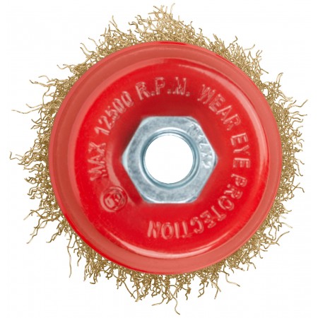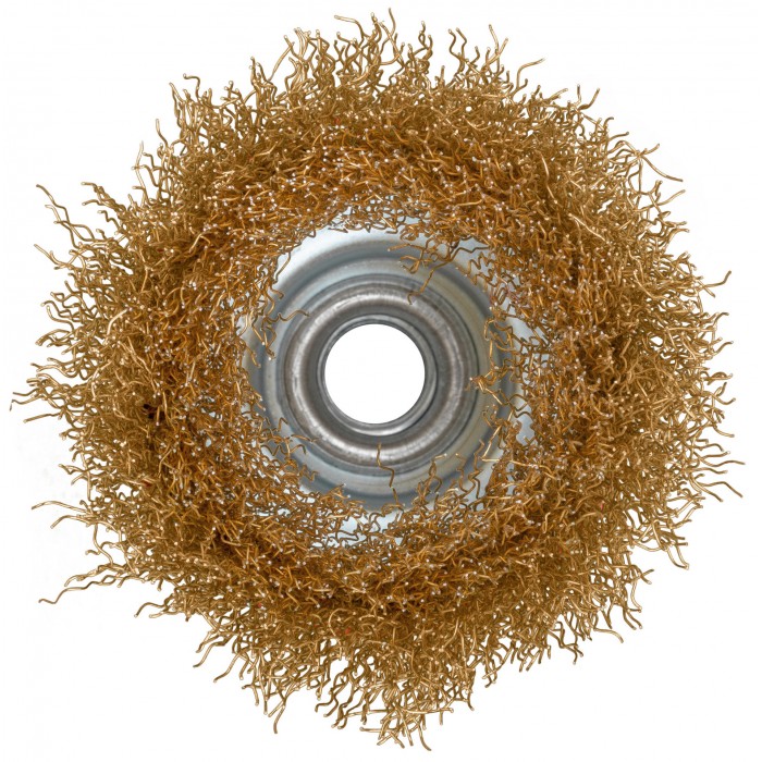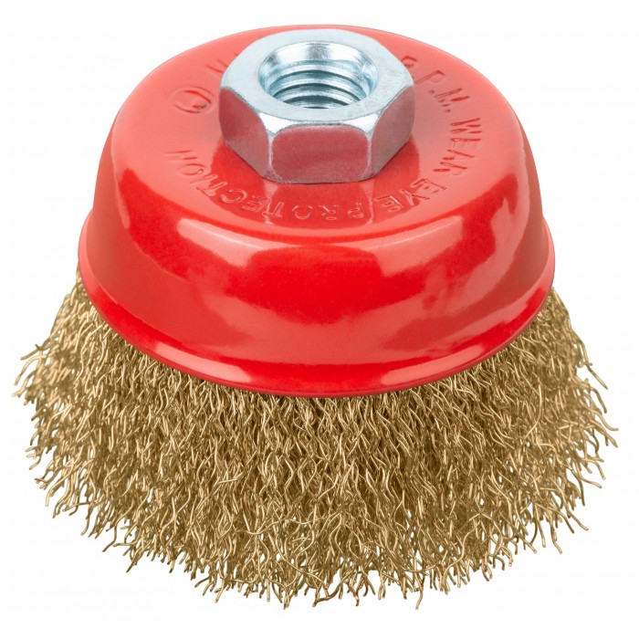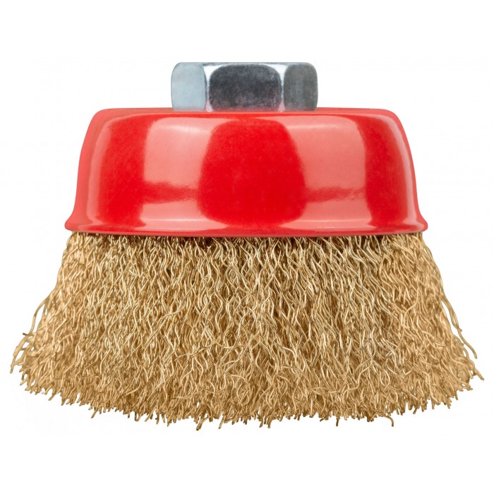 Корщетка-чашка, гайка М14, стальная латунированная волнистая проволока 75 мм (39267)