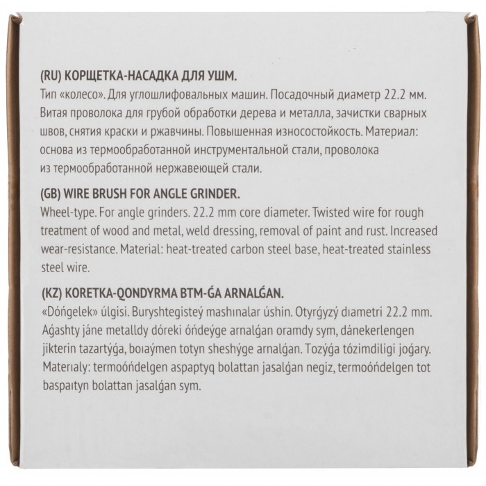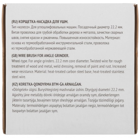 Тип «колесо». Для УШМ. Посадочный диаметр 22,2 мм. Повышенная износостойкость. Материал: витая проволока из нержавеющей стали, основа из инструментальной стали. Упаковка: картонная коробка.