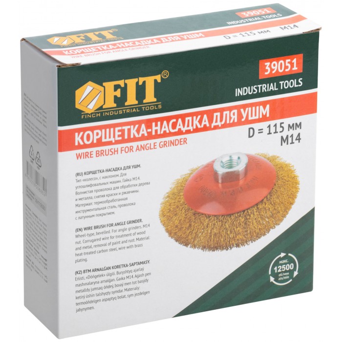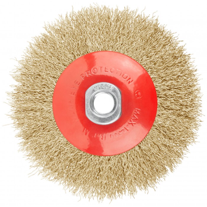 Тип «колесо», с наклоном, гайка М14. Для УШМ. Материал: стальная, латунированная, волнистая проволока. Упаковка: картонная коробка.