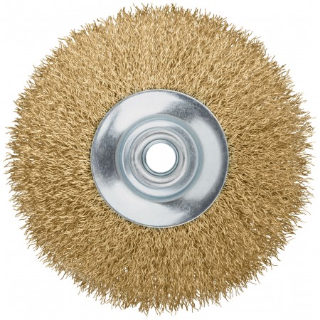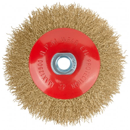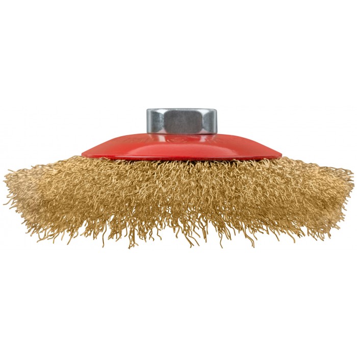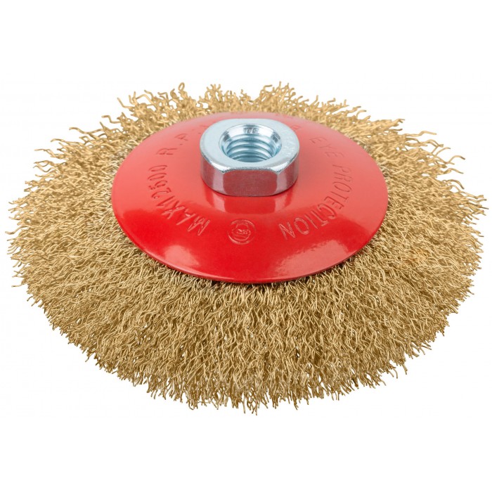 Корщетка-колесо с наклоном, гайка М14, стальная латунированная волнистая проволока 125 мм (39052)