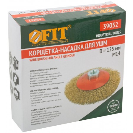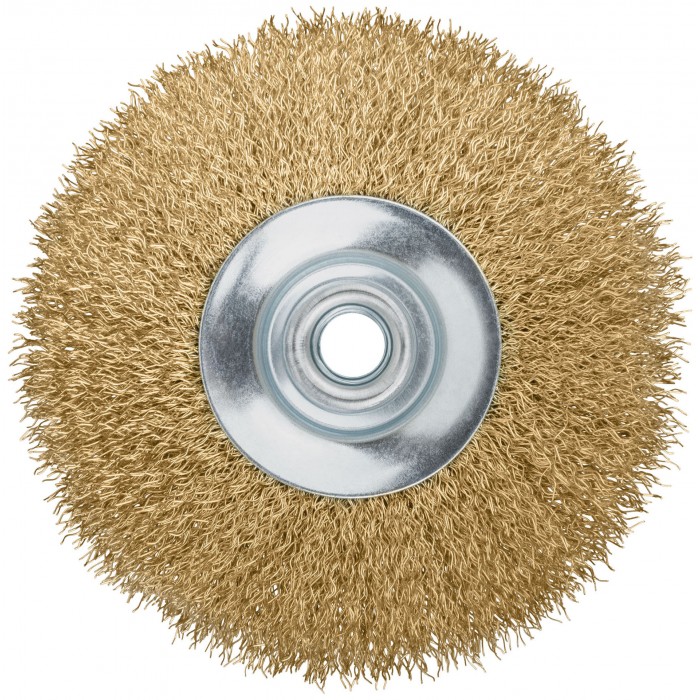 Тип «колесо», с наклоном, гайка М14. Для УШМ. Материал: стальная, латунированная, волнистая проволока. Упаковка: картонная коробка.