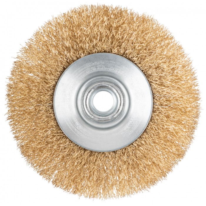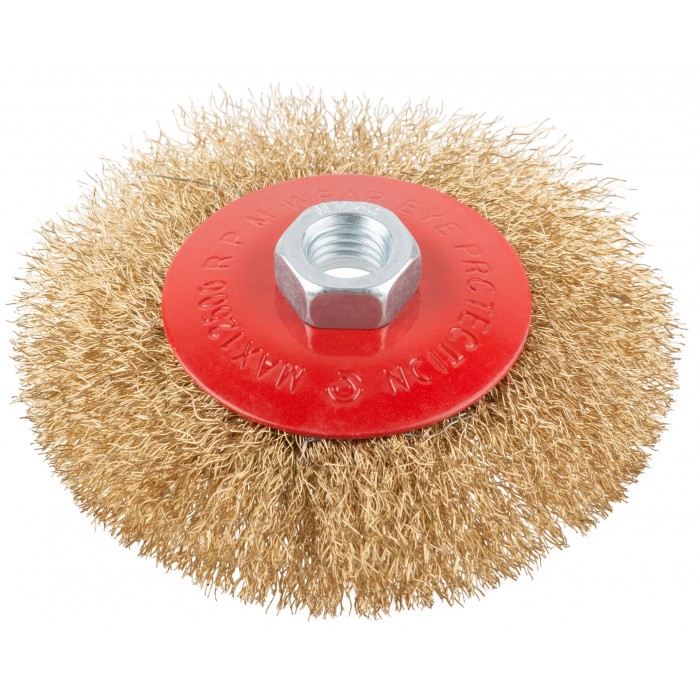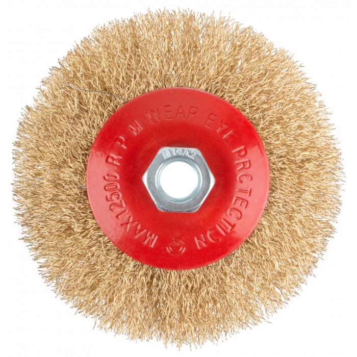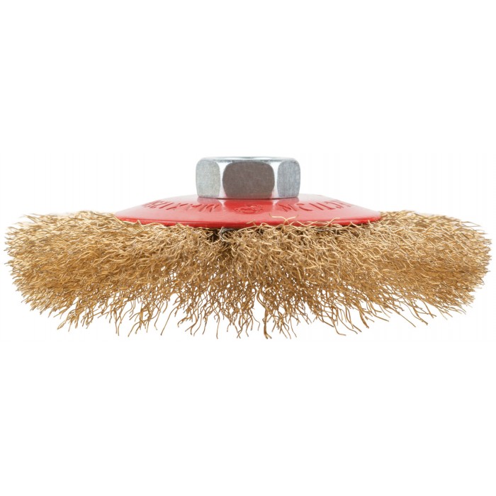Корщетка-колесо с наклоном, гайка М14, стальная волнистая латунированная проволока 115 мм (39022)