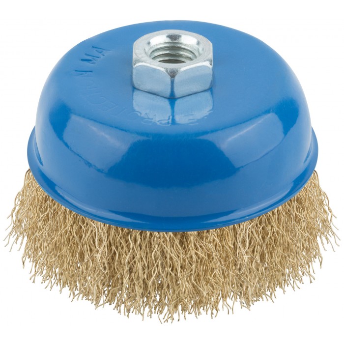 Тип «чашка». Для УШМ. Для очистки поверхностей от краски и ржавчины. Гайка М14. Латунированная волнистая проволока. Материал: инструментальная сталь. Упаковка: картонная коробка.