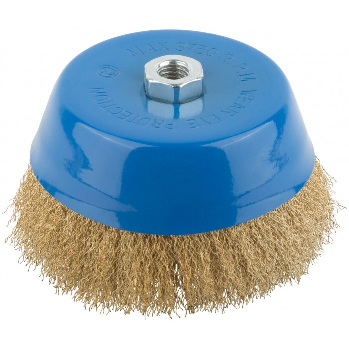 Тип «чашка». Для УШМ. Для очистки поверхностей от краски и ржавчины. Гайка М14. Латунированная волнистая проволока. Материал: инструментальная сталь. Упаковка: картонная коробка.