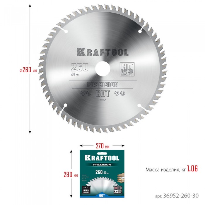 Пильный диск по дереву Precision, 260 х 30 мм, 60Т KRAFTOOL 36952-260-30