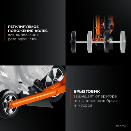 Для бензорезов Kraftool K760-14, K760-16, K770-14, K770-14 H, K770-16, K770-16 H. Применение тележки позволяет выполнять длинные ровные резы с заданной глубиной по прямой, по дуге, рядом с вертикальными поверхностями