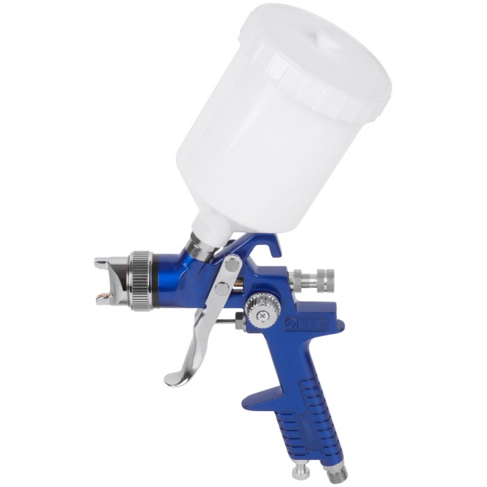 Краскопульт пневматический, 600 мл; 1,4 мм; расход воздуха 160 - 220 л/мин; рабочее давление 2,0 - 3,5 бар; ширина факела 160 - 240 мм. Материал: алюминий, сталь, пластик. Для пневмокомпрессора. Соединение байонет. С пластиковым верхним бачком. Возможность регулировки: факела, расхода краски и потока подачи воздуха. Используется с водоэмульсионными красками, синтетическими эмалями, полиуретановыми эмалями, эпоксидными эмалями, нитроэмалями, лаками и грунтовками.