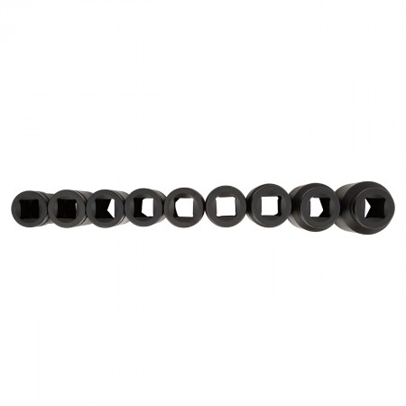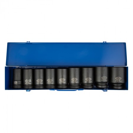 В наборе 9 удлиненных шестигранных головок размерами от 27 до 50 мм.