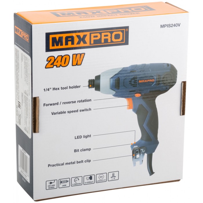 Шуруповерт ударный электрический 240 Вт; 0-3600 об/мин; 0-4200 уд/мин; патрон 6,35 мм под биту; 100 Нм; регулировка оборотов; реверс MAX-PRO 85040