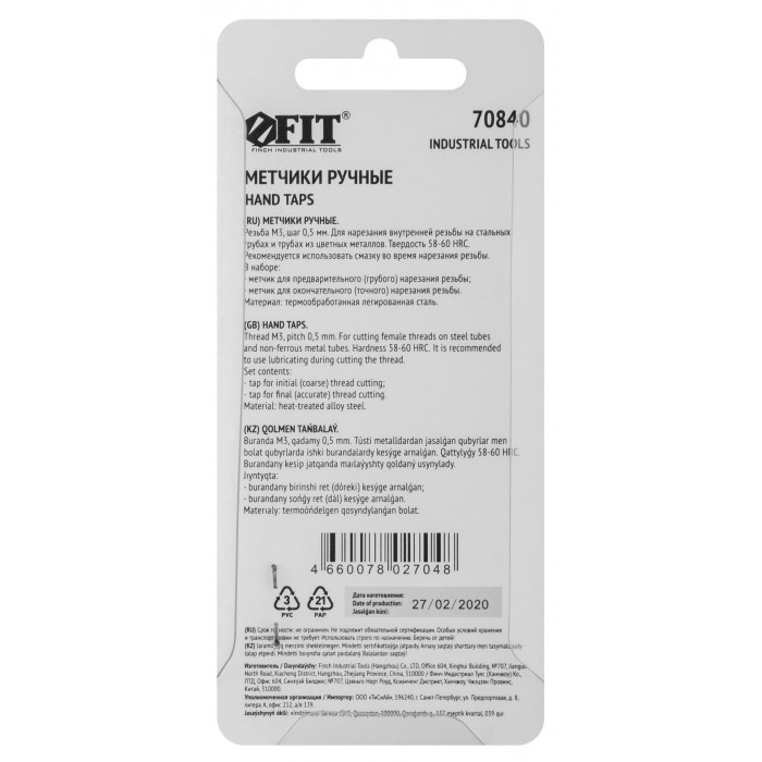 Набор 2 шт. (грубая и точная резьба). Для нарезания внутренней резьбы на изделиях из стали и цветных металлов. Закалка до HRC 58-60. Материал: легированная сталь. Упаковка: блистер.