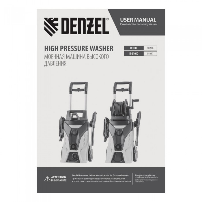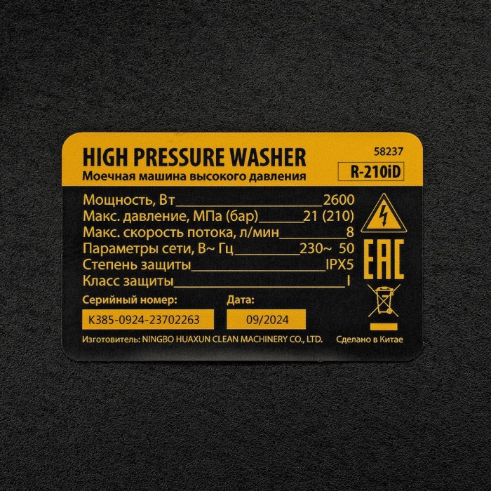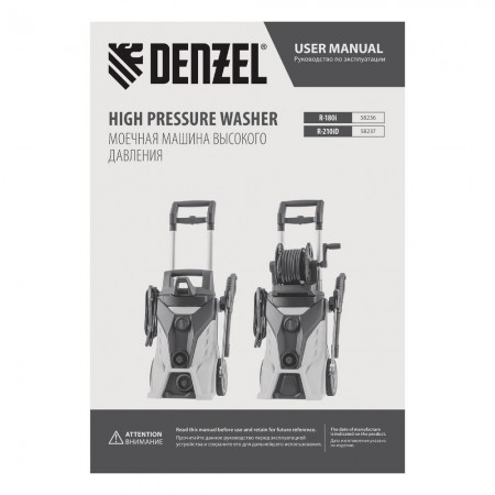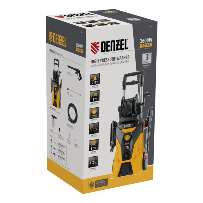 Моечная машина высокого давления R-210iD, 2600 Вт, 210 бар, 8.0 л/мин, асинхронный двигатель, барабан Denzel (58237)
