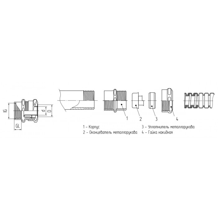 Назначение Герметичное соединение металлорукава номинальным диаметром 15 мм и трубы с наружной резьбой 1/2"