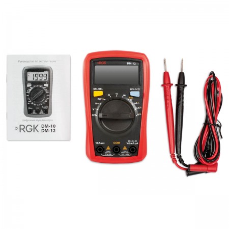Мультиметр цифровой RGK DM-12 , Кабель измерительный с пробниками - 2 шт., Батарея питания ААА - 2 шт., Руководство по эксплуатации