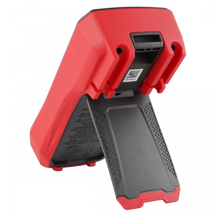 На задней поверхности устройства расположены петля для подвешивания и откидная подставка, которые позволяют установить измеритель так, чтобы специалисту было максимально удобно считывать показания, а руки были свободны для работы с щупами.