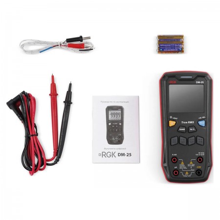 Мультиметр RGK DM-25 с поверкой , Кабель измерительный с пробниками - 2 шт., Батарея питания ААА - 3 шт., Термопара типа "К", Руководство по эксплуатации