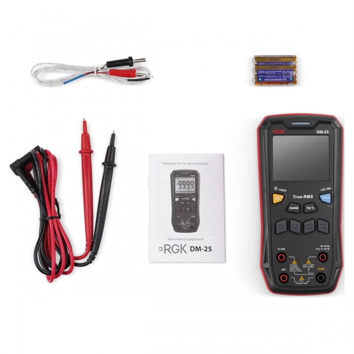 Мультиметр RGK DM-25 , Кабель измерительный с пробниками - 2 шт., Батарея питания ААА - 3 шт., Термопара типа "К", Руководство по эксплуатации
