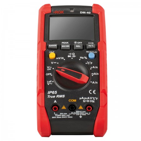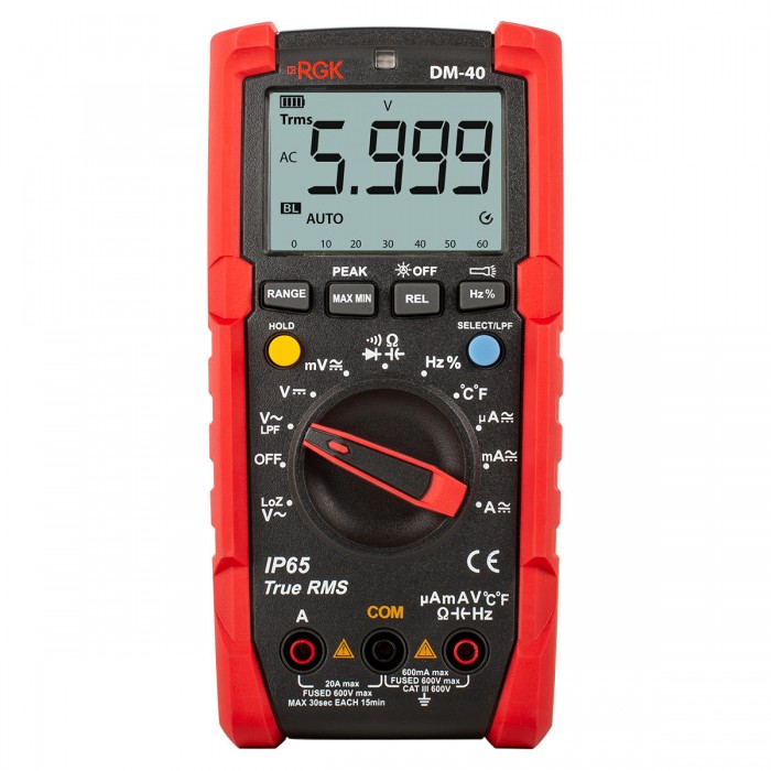 Многофункциональный мультиметр RGK DM-40 с поверкой соответствует стандарту CAT III 600В, благодаря чему может применяться для диагностики коммутационного оборудования, распределительных щитов и других элементов электросетей. Встроенные предохранители, изоляция разъемов и светозвуковая сигнализация, защищают устройство от перегрузки и непредвиденных скачков напряжения вплоть до 6 кВ. Защита корпуса от попадания пыли и проникновения капель воды соответствует классу IP65. Падения с высоты до 2 метров не сказываются на работоспособности приборы.