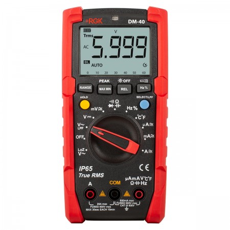 Мультиметр цифровой RGK DM-40 с поверкой, Кабель измерительный с пробниками - 2 шт., Чехол, Батарея питания 9 В, Термопара типа "К", Руководство по эксплуатации