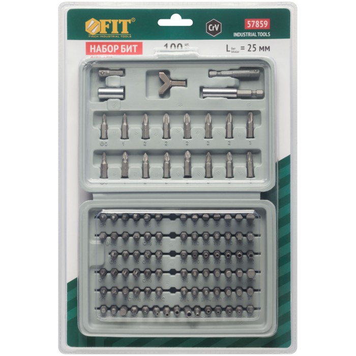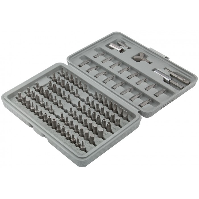 В чемоданчике. В наборе: 95 бит (L=25 мм); маг-нитный адаптер 1/4''; магнитный адаптер 60 мм; адаптер Y-типа для шуруп-кольца; 2 адаптера 25 мм – 50 мм. Биты: PH - 8 шт.; PZ - 8 шт.; S - 4 шт.; SL - 4 шт.; M - 3Eшт.; SL - 9 шт.; X - 3 шт.; Y - 4 шт.; CL - 3 шт.; T - 9 шт.; H - 19 шт.; с отверстием: T - 9 шт.; H - 12 шт. Материал: биты из хром-ванадиевой стали. Упаковка: пластиковая коробка вEблистере.