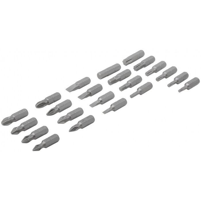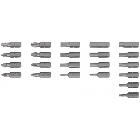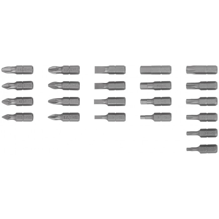 Биты 25 мм 22 шт: PH1, PH2 (2 шт), PH3, PZ1, PZ2 (2 шт), PZ3, T10, T15, T20, Т25, Т30, Т40, H3, Н4, Н5, Н6, SL3, SL4, SL5, SL6. Держатель для бит 60 мм: 1 шт