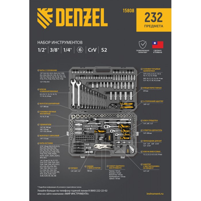 Набор инструментов, 1/2", 3/8", 1/4", CrV, S2, пластиковый кейс, 232 предмета Denzel