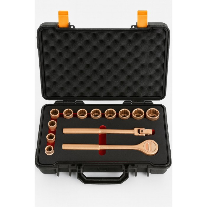 Набор торцевых головок искробезопасных №101 HORTZ. Торцевая искробезопасная головка предназначена для выполнения слесарно-монтажных работ в потенциально взрывоопасных зонах. Изготавливается в двух вариантах сплавов: алюминиевая бронза и бериллиевая бронза (AL-Cu & Be-Cu). Торцевые головки обладают высокой прочностью и точностью исполнения, что обеспечивает надёжный захват болтов и гаек. Инструменты из состава алюминиевая бронза и бериллиевая бронза подходят для использования в более сложных и опасных средах, где уровня защиты омедненных инструментов недостаточно для проведения работ. Сертифицирован в соответствии со стандартами взрывобезопасности ТР ТС 012/2011.
