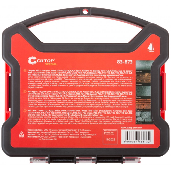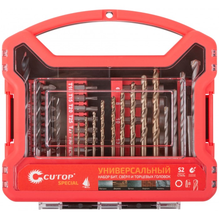 Биты изготавливаются из тайваньской стали высшего качества марки S2. Сверло изготовлено из высококачественной стали типа HSS. Предназначено для сверления отверстий в углеродистых и легированных сталях, серых и ковких чугунах, цветных металлах и пластике. Набор произведен по технологии Cutop. Универсальный набор, подходит для всех типов работ.