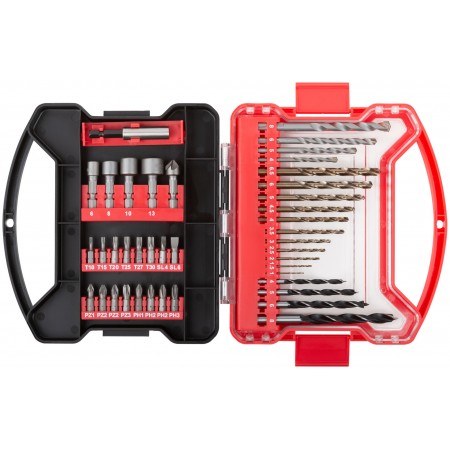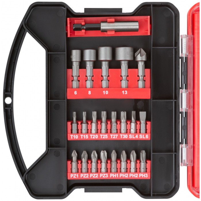 Сверло HSS 11 шт: (1/1.5/2/2.5/3/3.5/4/4.5/5/6/6.5 мм). Сверло по дереву 4 шт: (4/5/6/8 мм). Сверло по бетону 4 шт: (4/5/6/8 мм). Бита 25 мм 16 шт: PH1, PH2 (2 шт), PH3, PZ1, PZ2 (2 шт), PZ3, T10, T15, T20, Т25, Т27, Т30, SL4, SL6. Торцевые биты 4 шт: (6,8,10,13) Зенковка 1 шт. Адаптер для бит, с магнитным держ-лем 1 шт.