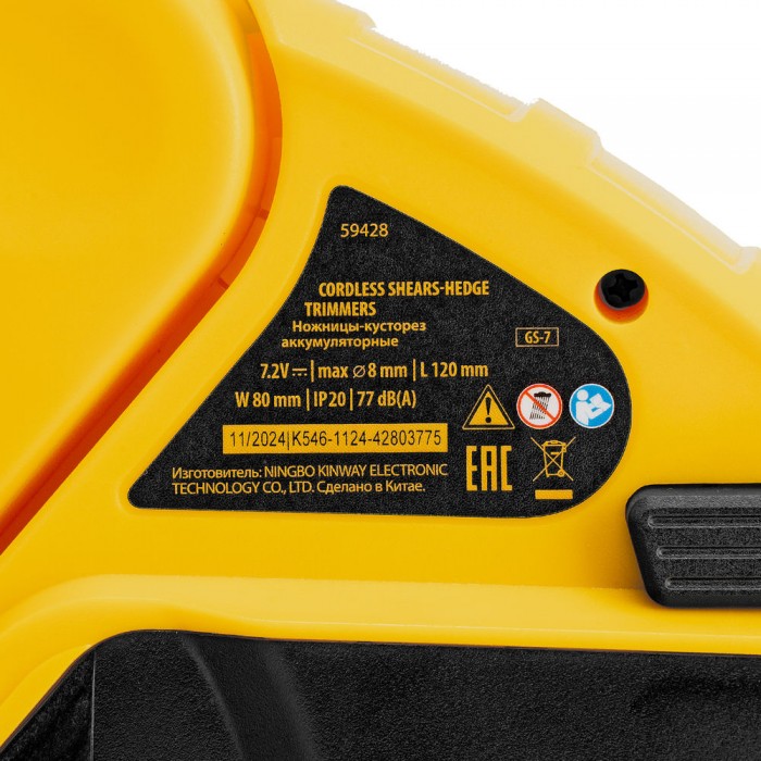Ножницы-кусторез аккумуляторные GS-7, Li-Ion, 7,2 В Denzel (59428)