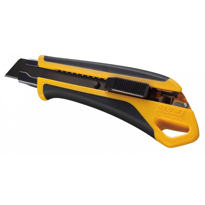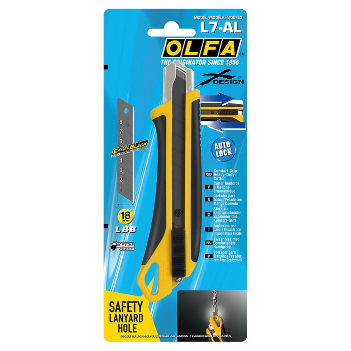 Универсальный нож OLFA L7-AL серии X-design ComfortGrip, с храповым механизмом и металлическим выступом. Легкий и простой в использовании оснащен эргономичной противоскользящей рукояткой устойчивой к кислотам, ацетону и маслам, усиленной фиберглассом. Эта комбинация обеспечивает удобный, надежный захват при выполнении самых сложных работ. Поставляется с черным лезвием LBB шириной 18 мм, которое на 25% острее стандартных лезвий OLFA. Просто отломите один из восьми сегментов, если лезвие затупилось. Полная замена происходит быстро и без дополнительных инструментов.