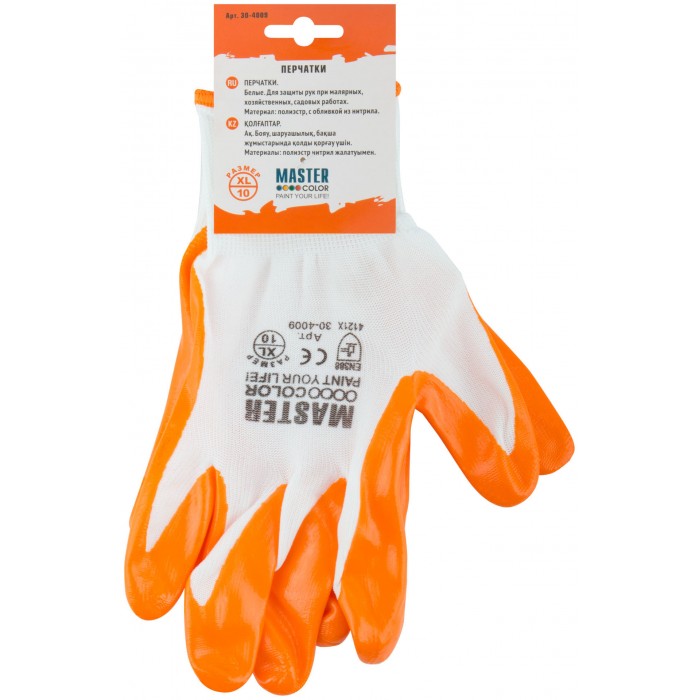 Перчатки белые, полиэстер с обливкой из нитрила (кислото-щелочно стойкие; водоотталкивающие), р-р ХL/10 (30-4009)