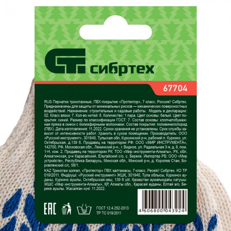 Перчатки х/б, ПВХ покрытие, "Протектор" 7 класс Сибртех (67704)