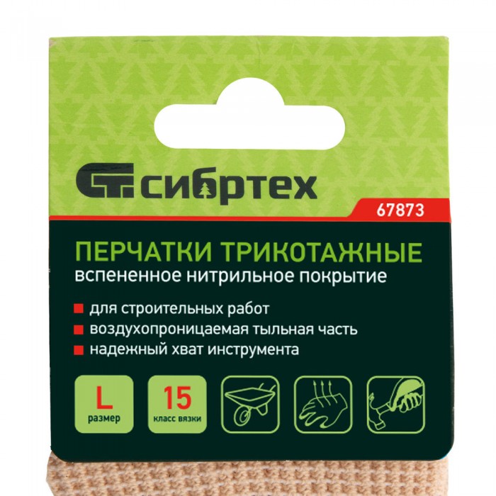 Перчатки трикотажные, вспененное нитрильное покрытие, размер L, 15 класс вязки Сибртех (67873)