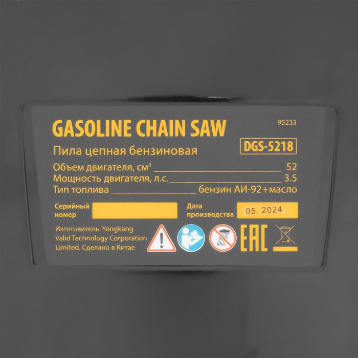 Пила цепная бензиновая DGS-5218, шина 45 см, 52 см3, 3.5 л.с, шаг 0.325, паз 1.5 мм, 72 звена Denzel (95233)