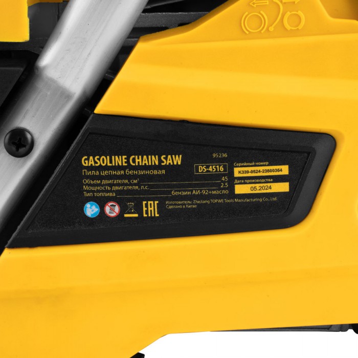 Пила цепная бензиновая DS-4516, шина 40 см, 45 см3, 2,5 л.с, шаг 0,325, паз 1,5 мм, 64 звена Denzel (95236)